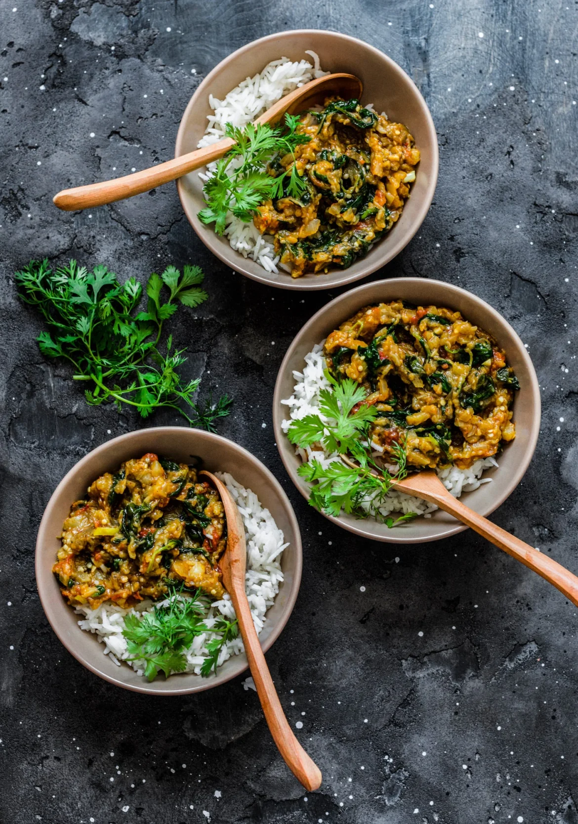 Aubergine spinach Vegetarian curry is very popular among us vegans. Aubergines for the curry are grilled directly over an open flame until charred. This infuses smoky flavor in the aubergine. The smoky flavor makes it an extraordinary dish.