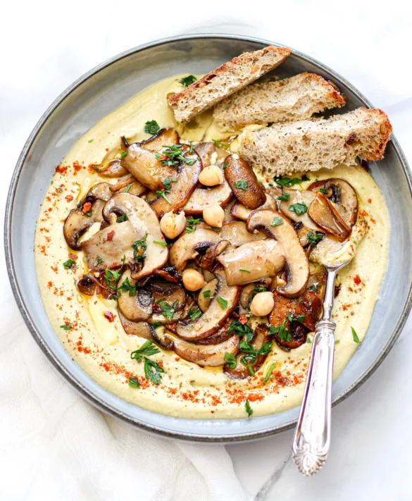 Put the hummus in a serving dish, sprinkle with paprika and on top add the browned mushrooms in the middle.