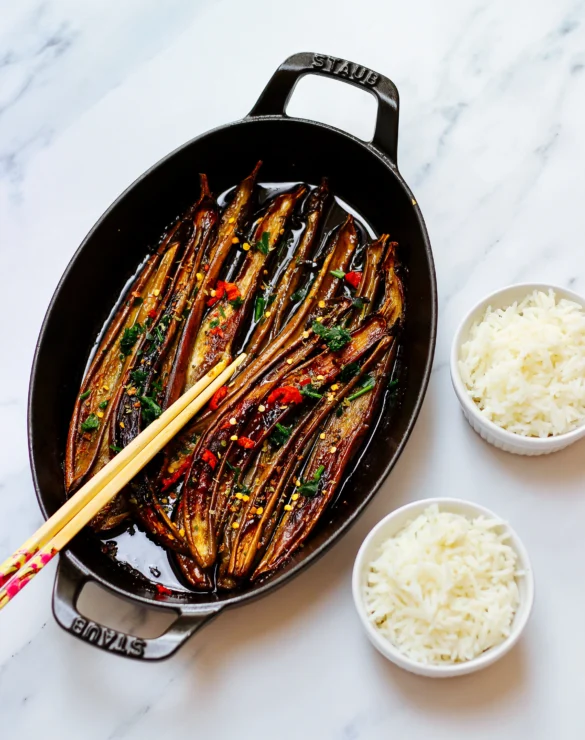 Cut the Chinese aubergines in half, then add salt. Separately, mix soy sauce, yakitori sauce, oil, ginger and grated garlic, and hot water. Mix well and pour the contents over the aubergines, mix well so that all the aubergines are covered with this condiment. Then put in the oven to bake at 352F for 30 minutes or until you see that they are nice caramelized.